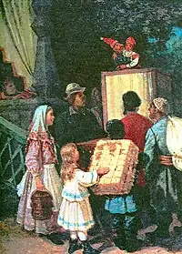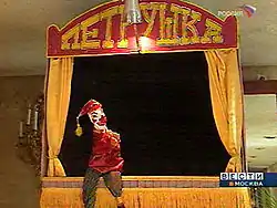 Петрушка — персонаж русского народного кукольного театра, главный герой одноимённого комического представления. Изображается в красной рубахе, холщовых штанах и остроконечном колпаке с кисточкой. В словаре В. Даля[1] это: