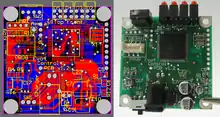 - Определение конструкции печатной платы (контур и габаритные размеры, крепёжные отверстия, максимально допустимая высота компонентов). Вычерчивание габаритов (краёв) платы, вырезов и крепёжных отверстий, областей запрета размещения компонентов. Размещение конструктивно-привязанных деталей: разъёмов, индикаторов, кнопок и др. Определение правил расположения критичных проводников: выделение областей прокладки сильноточных проводников и шин питания; компоновка высокочастотных и дифференциальных линий, определение методов прокладки и экранировки чувствительных к помехам цепей и цепей — источников помех.[5]