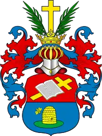 Щит увенчан дворянскими шлемом и короной. Нашлемник: золотой крест между двух пальмовых ветвей. Намет на щите голубой, подложенный красным.