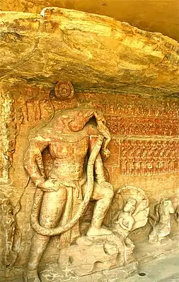 Символом пещерных храмов Удаягири стала монументальная панель с образом аватара Варахи. Она повествует об истории Вишну, воплотившегося в теле Варахи для спасения земли. Последняя представлена в образе Притхиви, богини земли. Вараха выглядит мужественным человекоподобным гигантом, а спасаемая им земля — маленькой и беззащитной женщиной. Оригинальная история изложена в Тайттирия-упанишада и Шатапатха-брахмана. Панель иллюстрирует выполнение божественного долга, победу и почитание праведности. Победа Варахи приветствуется мириадами божеств и святых, которым поклонялись в IV веке. Все фигуры одеты в традиционную индийскую одежду. Боги носят мужские дхоти, а богиня одета в женское сари. Монументальная панель даёт подробное представление о ранней иконографии Вишну и связанных с ним персонажей[3].