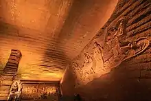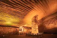 Потолки, стены и опорные столбы пещер покрыты следами выемки породы. Они представляют собой ряды параллельных полос шириной около 60 см, образованных рисками, оставленными инструментами, по некоторым предположениям являющимися специально созданными узорами. С направлением полос направление рисок составляет угол порядка 60°[1][2].