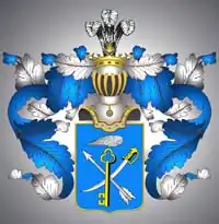 В щите, имеющем голубое поле, изображены крестообразно серебряная Сабля, Стрела (польский герб Пржестржал) и золотой Ключ (изм. польский герб Ясенчик), на поверхности которого видно Орлиное белое Крыло.