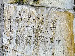 С точки зрения расшифровки — надпись предельно неудобна, так как написана неизвестной нам системой письма и неизвестным на сегодняшний день языком[1]. Надпись состоит из трёх слов, всего 6 символов, каждый из символов повторён трижды. В начале каждого слова стоит греческий крест, в конце последнего слова также начертан греческий крест. Хотя отдельные знаки надписи напоминают греческие, письменность неизвестна, как неизвестны и какие-либо другие тексты с её использованием. Первый знак (второй, если считать крест) пока не нашёл какой-либо приемлемой параллели с известными алфавитами — возможно, средневековая минускульная m. Второй знак (третий, если считать крест) в каждом слове напоминает греческую букву дельта. Третий (четвёртый, если считать крест) напоминает букву эта. Пятый (шестой, если считать крест) напоминает букву лямбда или готическую h. Кресты, судя по всему, призваны разделить слова между собой и открывают и закрывают надпись[1].