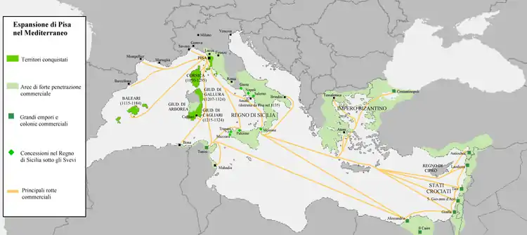 ![]() Торговая и территориальная экспансия Пизанской республики (XII век) — торговые маршруты, колонии и склады |