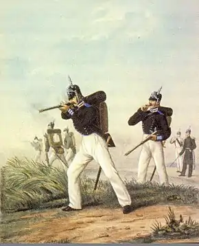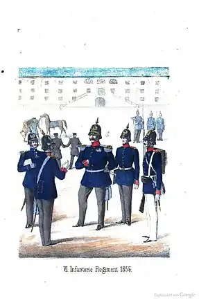 В 1855 г. каски отменены в пехотных частях армии (заменены на сужающиеся кверху кивера «шако» французского образца), оставшись только у гренадер, в кавалерии, гвардии и в военно-учебных заведениях.