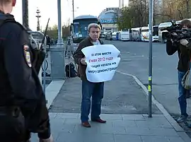 Федеральный закон от 19.06.2004 № 54-ФЗ «О собраниях, митингах, демонстрациях, шествиях и пикетированиях»[2] устанавливает (подп. 2 п. 4 ст. 5): «Организатор публичного мероприятия обязан не позднее чем за три дня до дня проведения публичного мероприятия (за исключением собрания и пикетирования, проводимого одним участником) информировать орган исполнительной власти субъекта Российской Федерации или орган местного самоуправления в письменной форме о принятии (непринятии) его предложения об изменении места и (или) времени проведения публичного мероприятия, указанных в уведомлении о проведении публичного мероприятия» — то есть проведение одиночного пикета не требует согласования с властями.