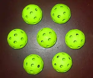 Мяч для пиклбола - пластмассовый, полый, с отверстиями. Диаметр - 70-76 мм. Вес - 21-29 граммов. Для игры на воздухе и в зале используются разные мячи. У мяча для открытого воздуха диаметр отверстий меньше, но отверстий больше. Стоит такой мяч около 2 долларов. Можно играть мячом для флорбола. Мяч стоит -100-140 рублей. Мяч для флорбола жестче и крепче, так как рассчитан на удар клюшкой, а не ракеткой.
