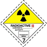 Упаковка II — Жёлтая применяется, если максимальный уровень излучения материала в любой точке его поверхности составляет от 0,005 мЗв/ч до 0,5 мЗв/ч. | ||