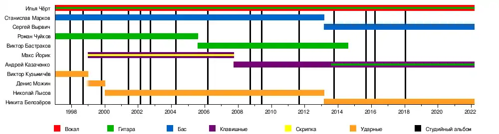 - Илья Чёрт — вокал, автор, электрогитара, акустическая гитара, губная гармошка, ударные (1997—наши дни)