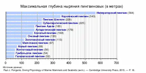 За день во время кормёжки пингвины могут проплыть около 27 км, на глубине более 3 метров птицы проводят в среднем около 80 минут в сутки. В нырянии некоторые пингвины бьют рекорды: более маленькие виды, такие как папуанский пингвин (Pygoscelis papua), могут находиться под водой в течение одной или (реже) более двух минут и нырять на глубину до 20 метров, но императорские пингвины способны задерживаться под водой на 18 минут и нырять на глубину более чем 530 метров. Хотя именно сверхспособности императорских пингвинов остаются мало изученными, известно, что при погружении пульс животного сокращается до одной пятой от частоты сердцебиения в состоянии покоя; таким образом потребление кислорода уменьшается, что позволяет увеличить продолжительность нахождения под водой при том же объёме воздуха в лёгких. Остаётся неизвестным механизм регулирования давления и температуры тела при погружении на большую глубину.