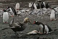 Поскольку пингвины гнездятся в основном на изолированных территориях, взрослые особи на суше практически не имеют естественных врагов; однако завезённые человеком млекопитающие, такие как собаки и кошки, представляют собой серьёзную опасность. Для самообороны пингвины используют клюв и плавники, являющиеся эффективным оружием. Но птенцы, оставшиеся без присмотра родителей, становятся лёгкой добычей для бурого поморника (Catharacta antarctica). Некоторые виды чаек используют любую возможность для того, чтобы украсть яйца пингвинов.