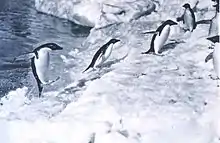 При выходе из воды пингвины могут в прыжке преодолеть высоту береговой линии до 1,8 м. Из-за их относительно коротких ног на суше пингвины передвигаются, переваливаясь с боку на бок — такой способ передвижения, как доказали исследования биомехаников, экономит много энергии. На суше пингвины развивают скорость 3—6 км/ч. На льду пингвины также могут быстро передвигаться — съезжают с гор, лёжа на животе. Некоторые виды преодолевают так многие километры между морем и местом, где обосновалась их колония.