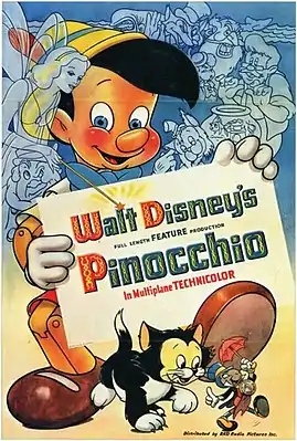 «Пиноккио» (англ. Pinocchio) — второй по счёту полнометражный анимационный фильм, снятый студией Walt Disney Productions по мотивам сказки итальянского писателя Карло Коллоди «Приключения Пиноккио. История деревянной куклы» (1883)[3]. Фильм удостоен двух премий «Оскар». Американская Киноассоциация присудила рейтинг G, означающий отсутствие возрастных ограничений, а в России фильм получил оценку 0+ (для любой зрительской аудитории).