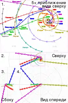- схематическое изображение Солнечной системы и траектория аппарата относительно планет.