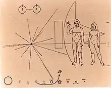 Пятнадцать расходящихся из единой точки линий позволяет вычислить звезду, от которой прилетел аппарат, и время старта. Рядом с четырнадцатью линиями нанесен двоичный код, который указывает период пульсаров, находящихся в окрестностях Солнечной системы. Поскольку со временем период пульсаров увеличивается по известному закону, можно вычислить время запуска аппарата.