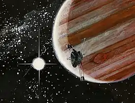 ![]() Пролёт «Пионера-10» вблизи Юпитера в представлении художника | |