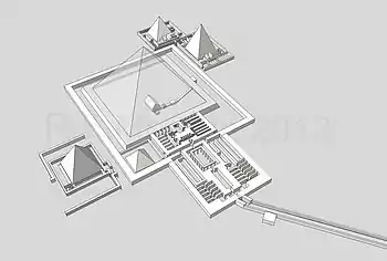 От нижнего храма к пирамиде вела «восходящая» дорога длиной свыше полукилометра и также крытая. Кончалась она вестибюлем заупокойного храма, который, как это было принято, делился на две части: внешнюю — перед оградой, доступную всем людям, и внутреннюю — отведенную для жрецов. Когда Жекье откопал поминальный комплекс из песка, он обнаружил в нём десятки тысяч фрагментов рельефов; на них был изображён царь в победоносных битвах с ливийцами и азиатами: избиение неприятеля на поле брани, массовое убийство пленных в путах, превращение их в рабов, вывоз воинских трофеев и т. п., но были и более мирные сцены, запечатлевшие, например, царя во время охоты па бегемотов и львов, царя, принимающего почести от сановников. Помимо бесчисленных изображений царя здесь можно было видеть и какого-то парнишку, который быстро взбирается по шесту за подвешенным на нём призом — рогаликом или пирогом. Используя найденные фрагменты рельефов, Жекье восстановил оформление стен двух храмов и мощеной дороги.