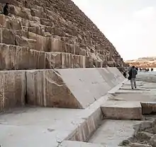 - Основание пирамиды покоится на природном скальном возвышении высотой в центре около 12—14 м и занимает, по последним данным, минимум 23 % от первоначального объёма пирамиды