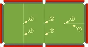 - коснуться двух разных бортов (или, отразившись от одного борта, довести другой шар до другого борта или коснуться другого шара, стоящего вплотную к другому борту), или