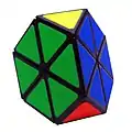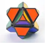 Клевер пираминкс. Но у него нет такой асимметрии, как с ромбододекаэдром, поэтому это обычный 3х3х3, у которого детали не джамблятся(не происходит такого, что повороты блокируются при потере формы).