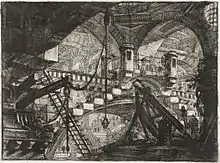 Особое место в творчестве Пиранези занимает серия гравюр «Фантастические изображения темниц», более известная как просто «Темницы». Эти архитектурные фантазии были впервые изданы в 1749 году. Через десять лет Пиранези вернулся к этой работе и создал на тех же медных досках практически новые произведения. «Темницы» — это мрачные и пугающие своими размерами и отсутствием постижимой логики архитектурные построения, где пространства загадочны, как непонятно и предназначение этих лестниц, мостиков, переходов, блоков и цепей. Мощь каменных конструкций подавляет. Создавая второй вариант «Темницы», художник драматизировал первоначальные композиции: углубил тени, добавил множество деталей и человеческих фигур — то ли тюремщиков, то ли узников, привязанных к пыточным приспособлениям.