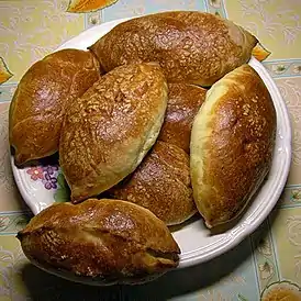 Пирожок — небольшое кулинарное изделие из дрожжевого, пресного или слоёного пресного теста с начинкой внутри[1], которое выпекается в печи или жарится во фритюре[2][3]. Форма печёных пирожков «лодочкой»[2] (удлинённо-приплюснутая с заострёнными концами) или овальная[1], жареных пирожков — овально-приплюснутая или «полумесяцем»[2][3].