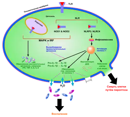 Пироптоз запускается сигналами опасности, которые распознаются во вне- и внутриклеточной среде двумя группами рецепторов опознавания паттерна: Nod-подобными рецепторами (NLR), находящимися в цитоплазме, и Toll-подобными рецепторами (TLR), расположенными в плазматической мембране[5]. Эти сигналы опасности могут выделяться патогенными организмами, при повреждениях тканей[6]. При связывании с NLR внутриклеточных бактериальных, вирусных или принадлежащих самой клетке сигналов опасности начинается сборка мультибелкового комплекса — инфламмасомы (от англ. inflammation — воспаление). Сборка инфламмасомы приводит к активации каспазы 1, которая необходима для образования и выделения провоспалительных цитокинов[7]. Наиболее хорошо изученная инфламмасома, NLRP3, имеет домены трёх главных типов: домены, содержащие обогащённые лейцином повторы (LRR), центральный нуклеотид-связывающий домен олигомеризации (NBD) и N-концевой пириновый домен (PYD)[8]. Взаимодействие каспазы 1 и NLRP3 осуществляется при помощи адаптерного белка ASC. ASC содержит домен активации и рекрутирования каспаз (CARD-домен), который связывается с прокаспазой 1 и облегчает её активацию через взаимодействие с её доменом CARD[9]. В результате прокаспазы 1 сближаются, димеризуются и разрезают друг друга на фрагменты p10 и p20, которые способы осуществлять процессинг про-IL-1β и про-IL-18. В других случаях инфламмасома активирует каспазу 1 через другие белки, содержащие домен CARD или PYD[10].