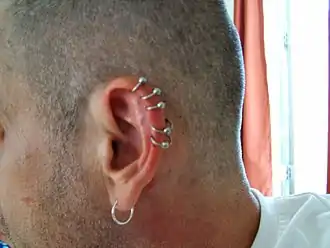 (также называется «пирсинг хеликса», англ. Helix piercing) — создание отверстия в завитке ушной раковины или в верхней части уха (хряще) с целью введения и ношения украшения.