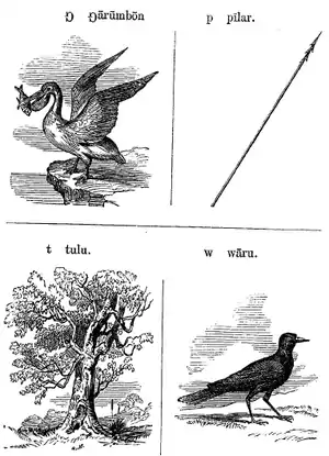 В большинстве австралийских письменностей используются только стандартные буквы английского алфавита, что приводит к необходимости использовать диграфы для тех звуков, которые не обозначаются отдельными буквами. Это в свою очередь может приводить к неоднозначностям. Например, и одна фонема /ŋ/, и сочетание /ng/ должны записываться одинаково. Чтобы их различать, сочетания записывается разными способами: n.g (с точкой), n’g (с апострофом) или nk.