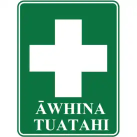 ![]() Знак «первая помощь» (āwhina tuatahi) с использованием современной орфографии. |