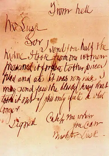 Среди множества писем, которые приходили якобы от Джека-потрошителя, в то время, когда происходили убийства в Уайтчепеле, исследователи выделяют письмо «Из ада» как одно из тех, которые в действительности могли быть написаны серийным убийцей[3]. Это письмо не подписано псевдонимом «Джек-потрошитель», как два предыдущих (Письмо «Дорогой начальник…» и Открытка «Дерзкий Джеки»); также письмо «Из ада» написано намного более неграмотно, нежели упомянутые выше два письма[4].