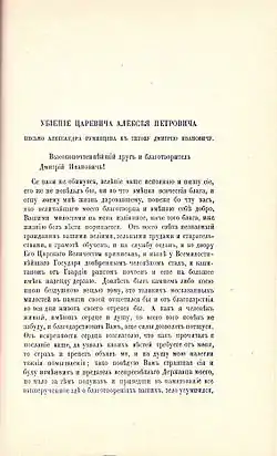 Согласно версии источника, ночью, после вынесения судом смертного приговора царевичу, Пётр I собрал нескольких доверенных лиц и сообщил им: «не хочу поругать царскую кровь всенародной казнию, но да совершится сей предел тихо и неслышно». По приказу царя Александр Румянцев, Иван Бутурлин, Пётр Толстой и Андрей Ушаков поехали в Петропавловскую крепость, где был заключен Алексей, под разными предлогами отослали окружавших царевича лиц и задушили его двумя пуховиками «от возглавия».