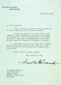 Рузвельт назначил Лаймана Бриггса из Национального бюро стандартов главой Уранового комитета для исследования проблем, поднятых в письме. В ноябре 1939 года комитет доложил Рузвельту, что использование урана позволит создать оружие, обладающее разрушительной силой, значительно превосходящей что-либо известное. В США был создан собственный проект по созданию атомного оружия. 19 октября 1939 года Рузвельт направил Эйнштейну ответное письмо, где благодарил за информацию и сообщал о начальных шагах по реализации проекта.[3]