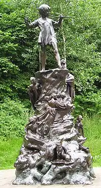 Первая статуя, изображавшая Питера Пэна, была заказана самим писателем скульптору Дж. Фрамптону и установлена ночью 30 апреля 1912 года в Кенсингтонских садах как первомайский сюрприз для лондонской детворы. Скульптура называется — «Питер Пэн, мальчик, который не хотел взрослеть». Парламент обвинил Барри в саморекламе. Однако, несмотря на скандал, статуя осталась в королевском парке.