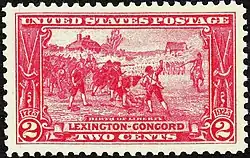 В 1925 году отмечалось 150-летие сражения, и были выпущены три почтовые марки стоимостью 1, 2 и 3 цента. Эти марки стали первыми марками, посвящёнными событиям войны за независимость. 2-центовая марка «Birth of Liberty» была основана на картине Генри Сэндхама «The Dawn of Liberty» 1885 года. Она изображает идеализированную версию перестрелки в Лексингтоне, на которой майор Питкерн и капитан Паркер приказывают открыть огонь[6].