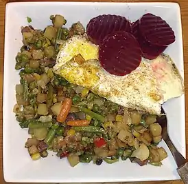 ![]() Питтипанна с овощами, ломтиками свёклы и яичницей | |