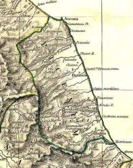 Согласно Страбону Пицен располагался между Апеннинами и Адриатическим морем от устья реки Эзино (лат. Aesis) на юге до Castrum в устье реки Тронто (лат. Truentinus), около 800 стадий. Страбон относит следующие города в Пицен: с севера на юг Анкона, Авксим, Септемпеда (Сан-Северино-Марке), Pneuentia, Потенца-Пичена, Фирм Пицен с портом в Кастелл (Порт-ди-Фермо), Купра Маритима, Трент (Truentum) на реке Truentinus (Тронто) и, наконец, Кастр Нов (Castrum Novum) и Матрин (Matrinum) на реке Matrinus (Piomba), к югу от Сильви в Абруццо. Это список прибрежных общин. Страбон также упоминает Адрию (Атри, Италия) и Аскул Пицен (лат. Asculum Picenum, Асколи-Пичено) в составе Пицена. Страбон пишет[1], что территория Пицена с востока на запад изменяется неравномерно.