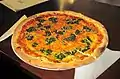- Pizza Regina — с помидорами, моцареллой, шампиньонами, ветчиной, орегано (иногда ещё и с чёрными оливками).