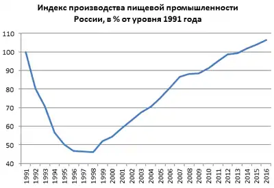 С началом рыночных реформ 1990-х годов в отрасли произошёл спад производства, вызванный в основном падением доходов большинства населения при одновременном росте конкуренции на внутреннем рынке со стороны импортной продукции. Значимым фактором падения производства явилось сокращение сельскохозяйственного производства, что существенное сузило сырьевую базу отрасли. Падение производства продолжалось вплоть до 1998 года. Модернизация действующих и создание новых предприятий в ряде подотраслей (производство колбасных изделий и мясных полуфабрикатов, молочной продукции, пива, папирос и сигарет) позволили нарастить объёмы производства[5].