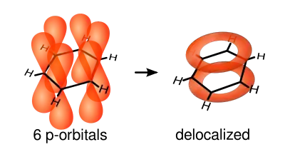 В случае образования ароматической системы, например, бензола (C6H6), каждый из шести атомов углерода находится в состоянии sp2-гибридизации и образует три сигма-связи с валентными углами 120°. Четвёртый p-электрон каждого атома углерода ориентируется перпендикулярно к плоскости бензольного кольца (рис. 3). В целом возникает единая связь, распространяющаяся на все атомы углерода бензольного кольца. Образуются две области пи-связей большой электронной плотности по обе стороны от плоскости сигма-связей. При такой связи все атомы углерода в молекуле бензола становятся равноценными и, следовательно, подобная система более устойчива, чем система с тремя локализованными двойными связями. Нелокализованная пи-связь в молекуле бензола обусловливает повышение порядка связи между атомами углерода и уменьшение межъядерного расстояния, то есть длина химической связи dcc в молекуле бензола составляет 1,39 Å, тогда как dC-C = 1,543 Å, а dC=C = 1,353 Å[3].