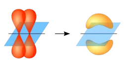 В атоме углерода один s- и три p-валентных электрона подвергаются гибридизации и становятся четырьмя равноценными sp3-гибридизированными электронами, посредством которых образуются четыре одинаковые химические связи в молекуле метана. Все связи в молекуле метана равноудалены друг от друга и образуют конфигурацию тетраэдра. В случае образования двойной связи сигма-связи образованы sp2-гибридизированными орбиталями. Общее количество таких связей у атома углерода три и они расположены в одной плоскости. Угол между связями — 120°. Пи-связь располагается перпендикулярно указанной плоскости (рис. 1). В случае образования тройной связи сигма-связи образованы sp-гибридизированными орбиталями, общее количество таких связей у атома углерода две и они находятся под углом 180° друг к другу. Две пи-связи тройной связи взаимно перпендикулярны (рис. 2).