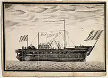 Оригинальный текст (англ.)[показатьскрыть]Her external appearance was forbidding and gloomy. She was dismantled: her only spars were the bowsprit, a derrick that looked like a gallows, for hoisting supplies on board, and a flagstaff at the stern. The port-holes were closed and secured. Two tiers of holes were cut through her sides, about two feet square and about ten feet apart, strongly guarded by a grating of iron bars.[3]