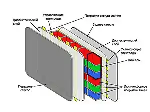 Плазменная панель представляет собой матрицу газонаполненных ячеек, заключённых между двумя параллельными стеклянными пластинами, внутри которых расположены прозрачные электроды, образующие шины сканирования, подсветки и адресации. Разряд в газе протекает между разрядными электродами (сканирования и подсветки) на лицевой стороне экрана и электродом адресации на задней стороне.