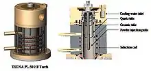Высокочастотные плазмотроны являются безэлектродными и используют индуктивную или ёмкостную связь с источником мощности. Поскольку для прохождения высокочастотной мощности сквозь стенки разрядной камеры, последняя должна быть выполнена из непроводящих материалов, в качестве таковых, как правило используется кварцевое стекло или керамика. Поскольку для поддержания безэлектродного разряда не требуется электрического контакта плазмы с электродами, применяют газодинамическую изоляцию стенок от плазменной струи, что позволяет избежать их чрезмерного нагрева и ограничиться воздушным охлаждением.