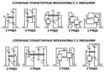 Сложных ПМ гораздо больше чем простых. Их точное число не определено ввиду отсутствия такой нужды, а наиболее распространённые из них приведены на рисунке. Точно так же как и простые ПМ, сложные имеют всего одно водило, но центральных зубчатых колёс может быть три и более. При этом в составе сложного ПМ всегда умозрительно можно выделить несколько простых ПМ (конкретно: три в четырёхзвенном и шесть в пятизвенном), каждый из которых в себя включает два каких-то центральных зубчатых колеса и одно общее водило.