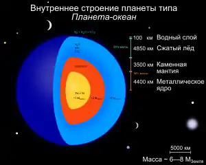 Плане́та-океа́н — разновидность планет, состоящих преимущественно изо льда, скалистых пород и металлов (приблизительно в равных пропорциях по массе для упрощения модели)[1]. В зависимости от расстояния до родительской звезды могут быть целиком покрыты океаном жидкой воды глубиной до 100 км (точное значение зависит от радиуса планеты), на большей глубине давление становится столь велико, что вода не может более существовать в жидком состоянии и затвердевает, образуя такие модификации льда, как Лёд V, VI и VII и другие. Пока открыта только одна такая планета — GJ 1214 b[1].