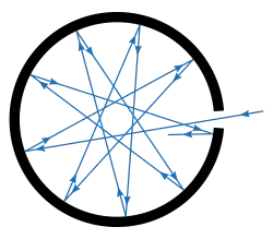 Весной 1895 года Планк представил Прусской академии наук свою первую работу по теории теплового излучения; результаты этой статьи были ограничены рядом специальных предположений, которые смягчались в последующих публикациях. Основной задачей для учёного стало применение второго начала термодинамики к процессам теплового излучения, которые анализировались с точки зрения максвелловской электромагнитной теории. Это предполагало рассмотрение взаимодействия электромагнитного поля с элементарным излучателем, в качестве которого Планк взял линейный гармонический осциллятор («резонатор»[Комм 2]) в полости, заполненной излучением. Такой выбор был оправдан универсальностью функции , не зависящей от природы тела, поэтому можно было ограничиться идеализированным случаем линейного резонатора. В течение года Планк написал вторую работу, в которой получил уравнение для осциллятора, взаимодействующего с полем, с учётом радиационного затухания; это уравнение использовалось в дальнейших исследованиях[95]. В начале 1900 года вышла большая статья Планка «О необратимых процессах излучения» (Über irreversible Strahlungsvorgänge), в которой были суммированы результаты его исследований проблемы теплового излучения на протяжении предыдущих трёх лет. Основной задачей учёного в эти годы была демонстрация того, что взаимодействие осцилляторов с излучением приводит к необратимому процессу установления равновесия в системе, однако вскоре он убедился, что одних законов механики и электродинамики для этого недостаточно. Под влиянием критики со стороны Больцмана Планк ввёл в свой анализ дополнительное предположение о «естественном излучении» (то есть некогерентности гармонических колебаний, на которые можно разложить излучение), во многом аналогичное гипотезе «молекулярного хаоса» в больцмановской кинетической теории газов. Воспользовавшись этим предположением, Планк смог получить уравнение, связывающее энергию осциллятора с интенсивностью излучения на определённой частоте. Введя далее понятие электромагнитной энтропии как функции энергии осциллятора, Планк сформулировал «электромагнитную H-теорему» и дал термодинамическую трактовку стационарных процессов излучения. При помощи своего выражения для энтропии он определил температуру электромагнитного излучения и в качестве следствий получил закон излучения Вина и закон Стефана — Больцмана. При этом попытка изменения распределения излучения с виновского на какое-либо иное требовала изменения выражения для энтропии, что, по словам Планка, приводило к противоречию с принципом возрастания энтропии[96][97]. Существенно, что на этом этапе учёный по каким-то причинам не воспользовался известной теоремой о равнораспределении энергии по степеням свободы, которая привела бы его к несогласующемуся с опытом закону излучения Рэлея — Джинса[98][99].