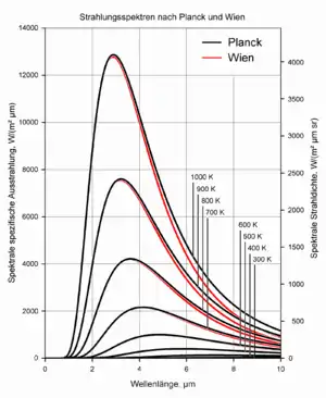 К тому моменту, когда Планк приступил к работе над теорией теплового излучения, перед этой дисциплиной стояла проблема фундаментальной важности — рассчитать распределение энергии в спектре равновесного излучения абсолютно чёрного тела, то есть тела, полностью поглощающего падающее на него излучение во всём спектральном диапазоне. Хорошей практической реализацией абсолютно чёрного тела является небольшое отверстие в стенке замкнутой полости; внутри такого устройства устанавливается равновесие между излучением и веществом, так что излучение, выходящее из отверстия, близко по своим характеристикам к излучению чёрного тела. Важность функции , описывающей испускательную способность абсолютно чёрного тела при данной температуре и на данной частоте , определяется законом Кирхгофа (1859), согласно которому отношение испускательной и поглощательной способностей любого тела равно как раз универсальной функции . К концу XIX века было установлено несколько закономерностей, касающихся равновесного излучения абсолютно чёрного тела. Так, закон Стефана — Больцмана (1879, 1884) утверждает температурную зависимость объёмной плотности энергии излучения, величины, интегральной по всем частотам в спектре. Закон смещения Вина (1893) позволил свести задачу поиска функции двух аргументов к нахождению функции одной переменной . Кроме того, этот закон определяет смещение максимума спектра излучения при изменении температуры. Попытки вывести зависимость из термодинамических и электродинамических соображений предпринимались такими физиками, как Владимир Михельсон (1887) и Вильгельм Вин (1896); последнему удалось получить закон нормального распределения излучения в спектре чёрного тела, получивший приблизительное подтверждение в измерениях Фридриха Пашена, Отто Люммера и Эрнста Прингсгейма[91][92]. С практической точки зрения эти исследования были обусловлены необходимостью поиска новых источников света и, в частности, создания стандартов для оценки электрических ламп накаливания[93][94].