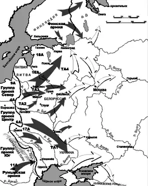 Германское руководство исходило из необходимости обеспечить разгром советских войск на всём протяжении линии фронта. В результате задуманного грандиозного «пограничного сражения» у СССР не должно было оставаться ничего, кроме 30-40 резервных дивизий. Этой цели предполагалось достичь наступлением по всему фронту. Основными оперативными линиями были признаны московское и киевское направления. Их обеспечивали группы армий «Центр» (на фронте 500 км сосредотачивалось 48 дивизий) и «Юг» (на фронте 1250 км сосредотачивалось 40 немецких дивизий и значительные силы союзников). Группа армий «Север» (29 дивизий на фронте 290 км) имела задачу обеспечивать северный фланг группы «Центр», захватить Прибалтику и установить контакт с финскими войсками. Общее число дивизий первого стратегического эшелона, с учётом финских, венгерских и румынских войск, составляло 157 дивизий, из них 17 танковых и 13 моторизованных, и 18 бригад[17].
