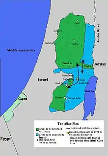 Согласно предложению, эта оккупация должна была быть прекращена, завоеванные территории в основном возвращены и, таким образом, будет заложена основа для мира между Израилем и его арабскими соседями. Часть Западного берега должна была быть возвращена Иордании (этот район должен был быть связан с Иорданией широким коридором вокруг Иерихона), создав таким образом иордано-палестинское государство. Оно также должно включать Сектор Газа, который будет связан с Западным берегом автомобильной дорогой (согласно первоначальной версии план должен был оставаться частью Сектора Газа, но в окончательном варианте уже считался частью Иордано-Палестинского государства).[2] Большая часть Синайского полуострова должна была быть возвращена Египту.[3]